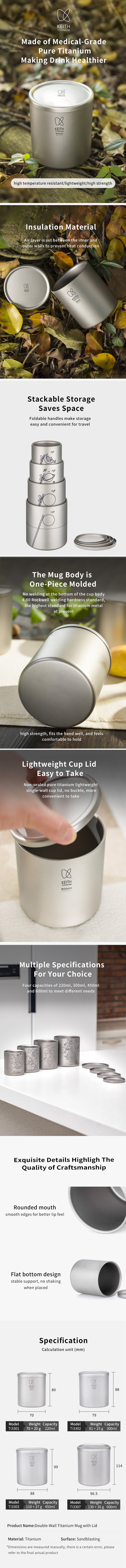 KEITH double-wall mug is made of medical-grade pure titanium, which is resistant to acid and alkali, corrosion, durable and strong. There are multiple capacity options from 220ml to 600ml to meet different needs.