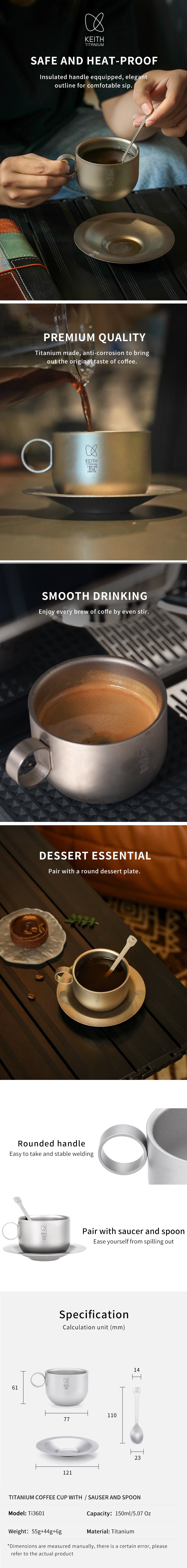 KEITH coffee cup set, made of pure titanium, safe and healthy, enjoy a high-quality life, consists of a cup holder, a 150ML double-layer coffee cup and a small spoon. It can be used to brew coffee or tea, is not easy to produce scale, and is easy to clean.
