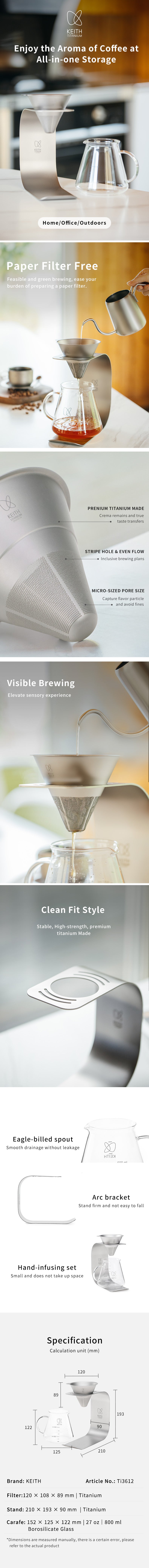 Specification:Filter:120 × 108 × 89 mm | Titanium Stand: 210 × 193 × 90 mm | Titanium Carafe: 152 × 125 × 122 mm | 27 oz│800 ml Borosilicate